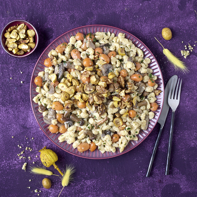 Pilzrahm-BIO Eierknöpfle mit Pariser Karotten, Maronen und Walnuss-Crunch