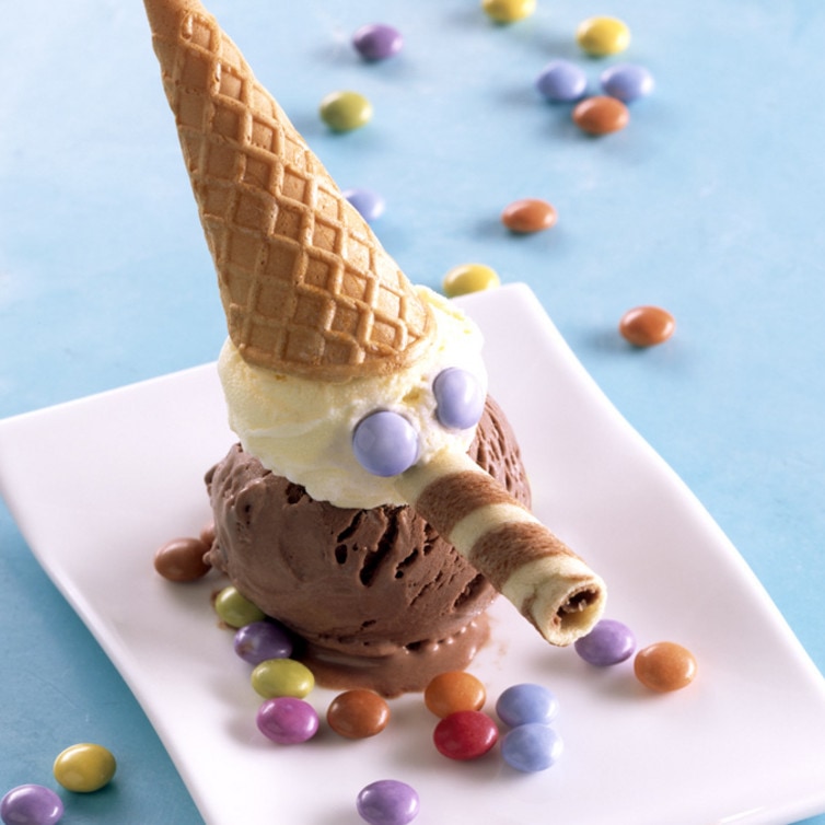 Leuke én lekkere ijscreatie voor kinderen (en volwassenen) met chocolade- en vanille-ijs.