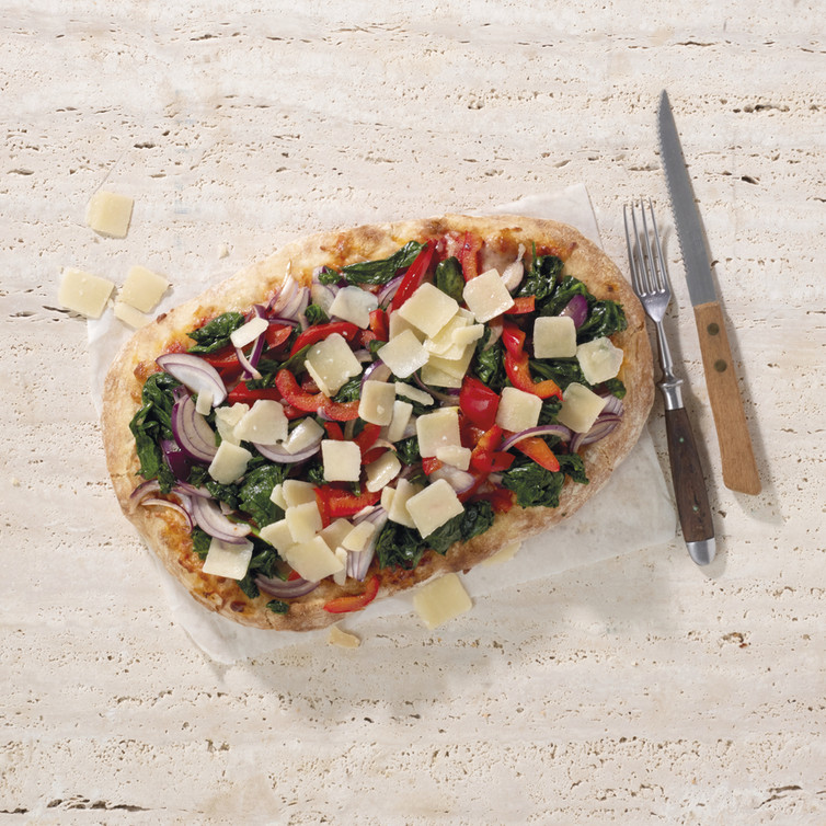 Feuchtigkeit vor dem Belegen erneut aus dem Spinat drücken und die Pinsa mit Spinat, Paprika- und Zwiebelstreifen belegen. Im Backofen ca. 20 Minuten goldbraun und knusprig braten.