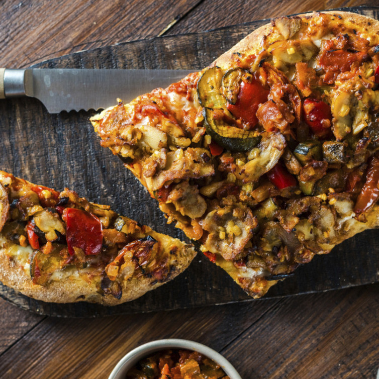 Das Hähnchenfleisch und das Ratatouille auf der Pinsa gleichmäßig verteilen.