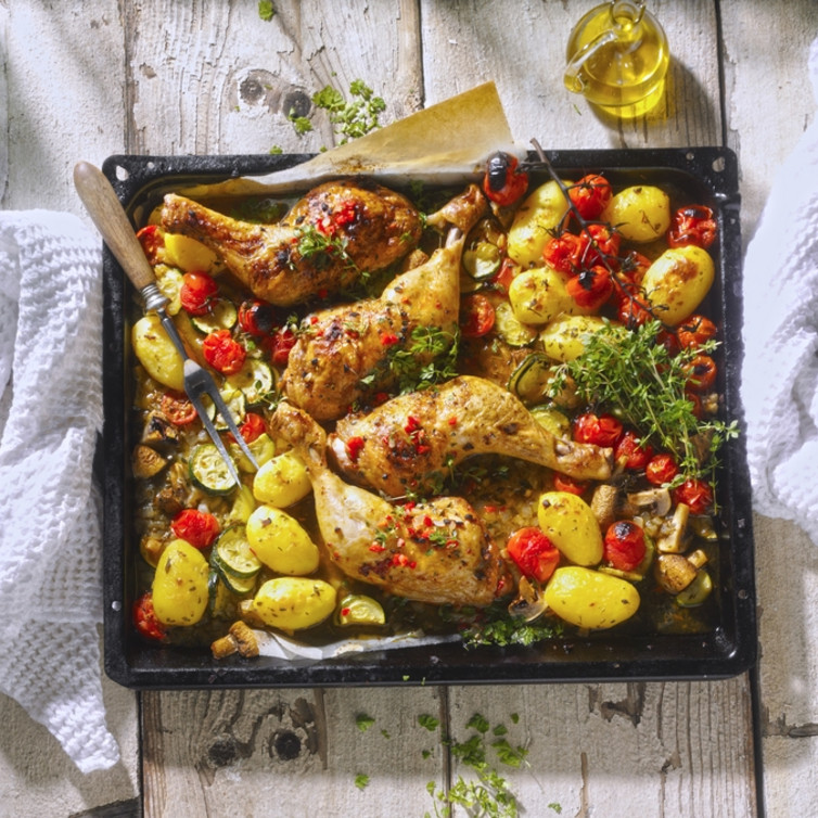 Hähnchenkeulen im Backofen bei Auftaufunktion auftauen lassen. Kartoffeln gründlich waschen und in kochendem Salzwasser ca. 15 Minuten vorgaren. Champignons abbürsten und vierteln. Zucchini und Tomaten waschen, bei den Zucchini die Enden abschneiden und die Zucchini in ca. 1 - 2 cm dicke Scheiben schneiden.