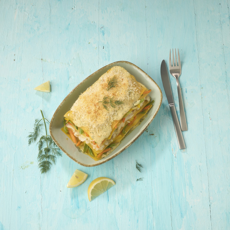 Eine Auflaufform leicht einfetten. Etwas Sauce auf dem Boden verteilen. Dann abwechselnd Lasagneplatten, Gemüse, Pulled Cod und Sauce einschichten. Mit Lasagneplatten und Sauce abschließen.
