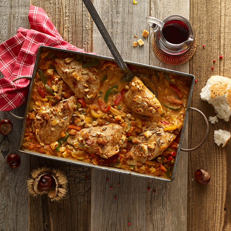 Die Schnitzel auf das Gemüse legen, mit den Toastbrotscheiben-Würfeln und dem Käse bestreuen und in den Backofen schieben.