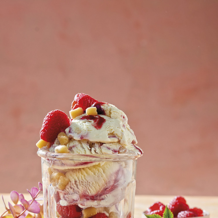 Die Himbeeren verlesen und die Hälfte zusammen mit Locken vom Eis in ein schönes Glas schichten.