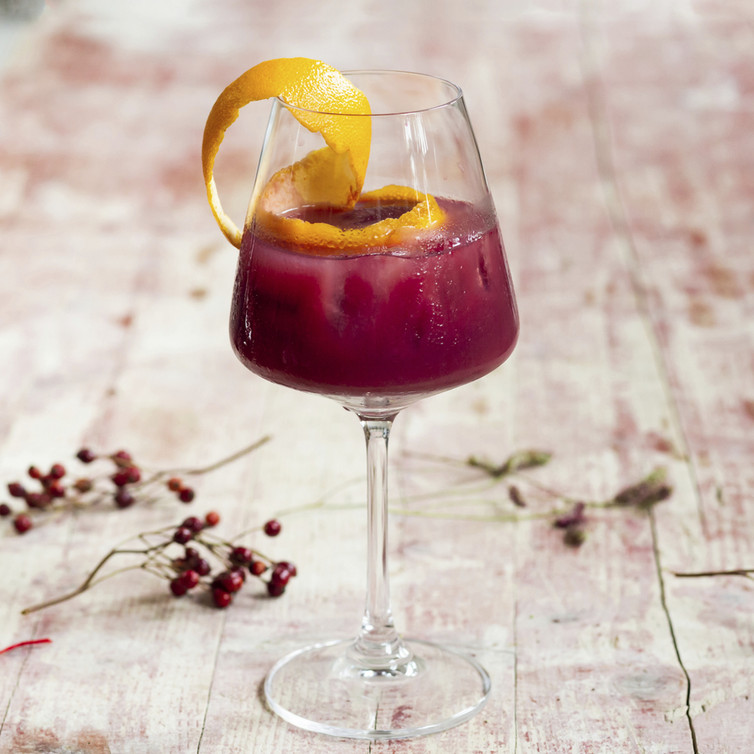 Den Rotwein, Orangensaft und Zitronensaft mit Eiswürfeln kräftig shaken und in Gläser füllen. Mit einer Orangenschalenspirale dekorieren.