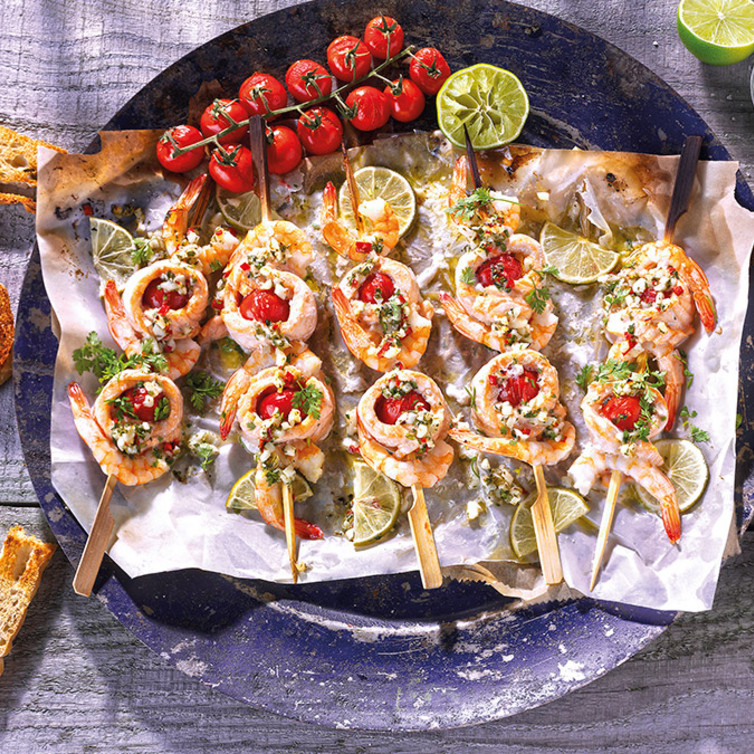 Riesengarnelen-Lachsspieß mit Oliven-Kräuter-Öl