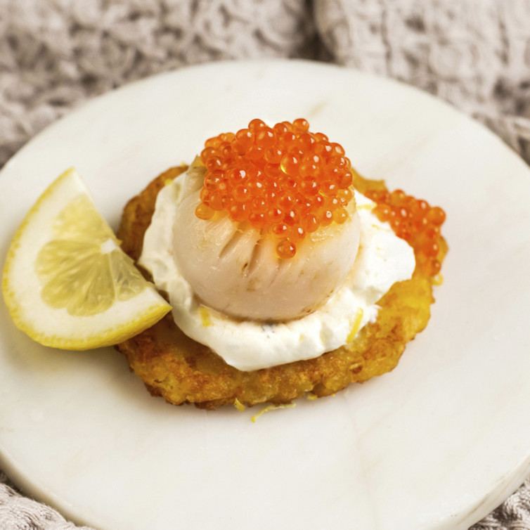 Auf jedes Röstinchen eine gebratene Jakobsmuschel setzen, mit Zitronenschaum, Lachskaviar und Zitronenscheibe dekorieren.