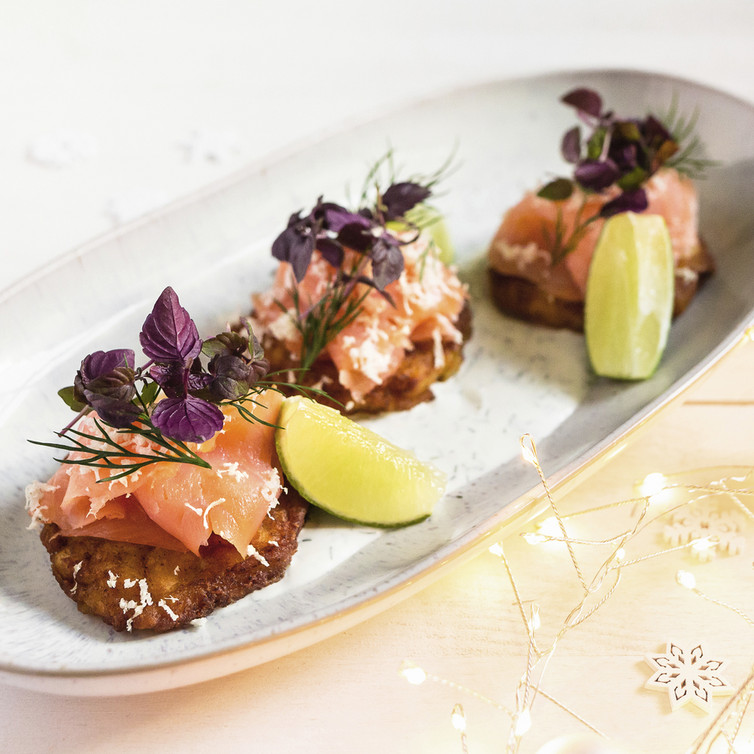 Die lauwarmen Röstinchen auf die Crème fraîche setzen, mit Räucherlachsscheiben belegen, mit Limettenspalten, Shiso-Kresse und frischem Meerrettich garniert servieren.