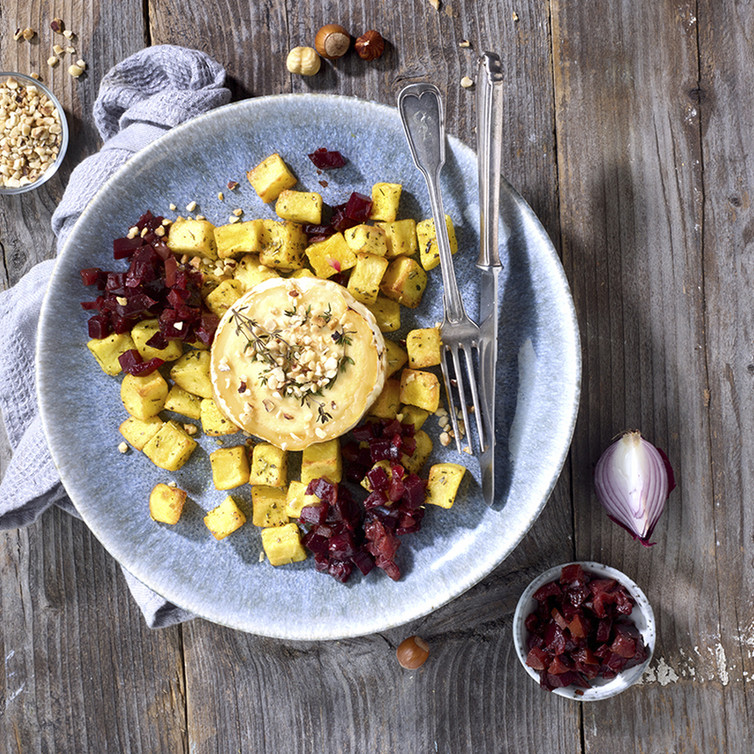 Röstkartoffel-Würfel mit gratiniertem Ziegenkäse, Haselnüssen & Rote-Bete-Chutney