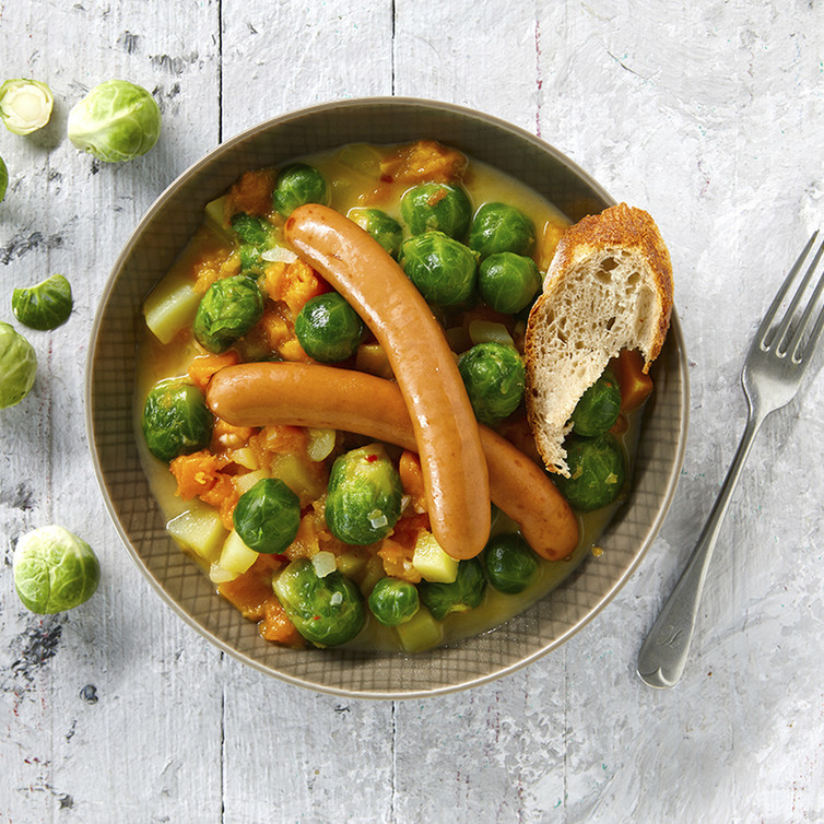 Rosenkohl-Kürbiseintopf mit Wiener Würstchen