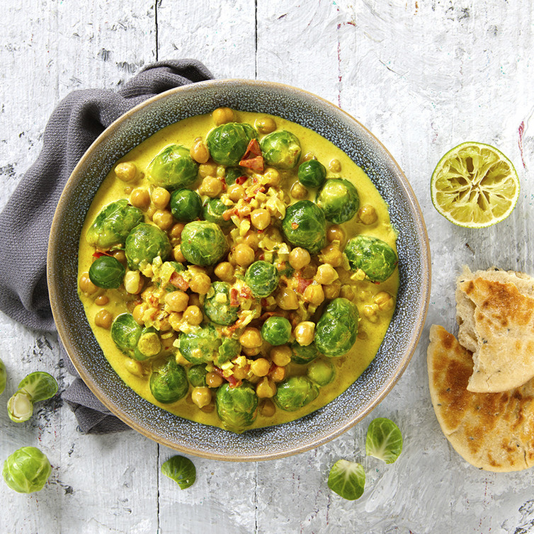 Die abgetropften und gespülten Kichererbsen sowie die tiefgefrorenen Rosenkohlröschen in die Currymischung geben. Das Curry für etwa 15 bis 20 Minuten köcheln lassen, bis der Rosenkohl weich ist. Mit abgeriebener Limettenschale und Saft würzen und nach Belieben mit Salz und Pfeffer abschmecken.