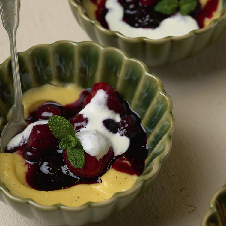Rote Grütze mit selbstgemachtem Vanillepudding und Sahne