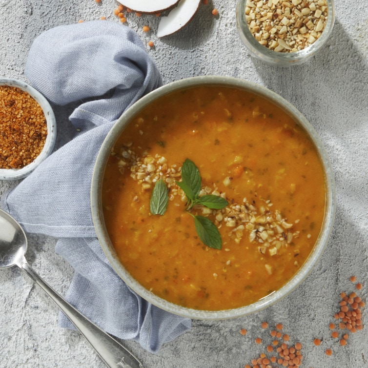 Rote Linsen-Kokos-Suppe mit Mandel Dukka und geräuchertem Chipotle Chilisalz