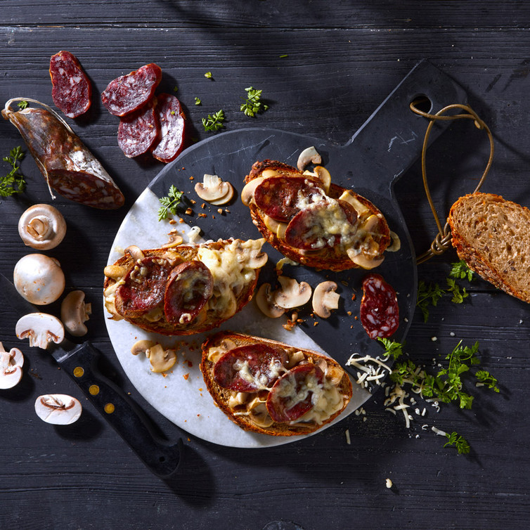 Die Salami in hauchdünne Scheiben schneiden. Das Hüttenbrot in Scheiben schneiden. Anschließend mit der Salami und den gebratenen Champignons belegen. Den Bergkäse darüberstreuen und kurz übergrillen. Direkt servieren.