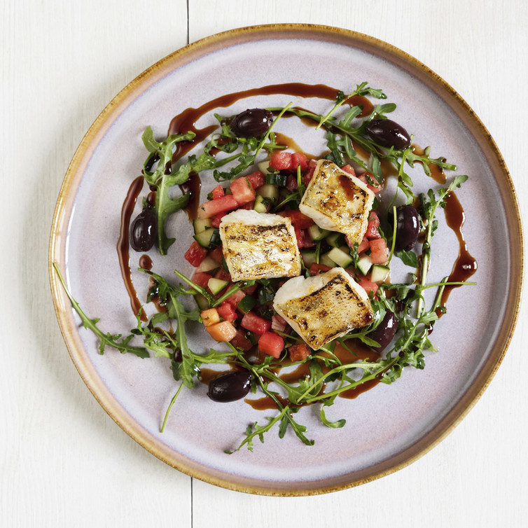 Rucola putzen, waschen und trockenschleudern, Kalamata-Oliven halbieren und beides auf Tellern anrichten. Zanderstücke darauflegen und etwas vom Relish über Salat und Zander verteilen. Das restliche Relish dazu servieren, mit ein paar Tropfen Aceto Balsamico beträufeln.