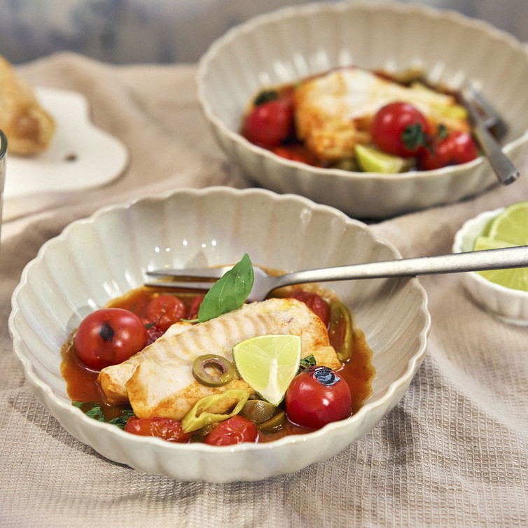 Sanft pochierter Kabeljau in würziger Rösttomatensauce