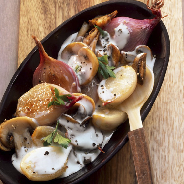 Das Schalottengemüse ist eine ausgezeichnete Beilage zu dunklem Fleisch wie Rinderfilet oder Wild. Ein trockener und vollmundiger Rotwein unterstreicht den Geschmack der Schalotten.