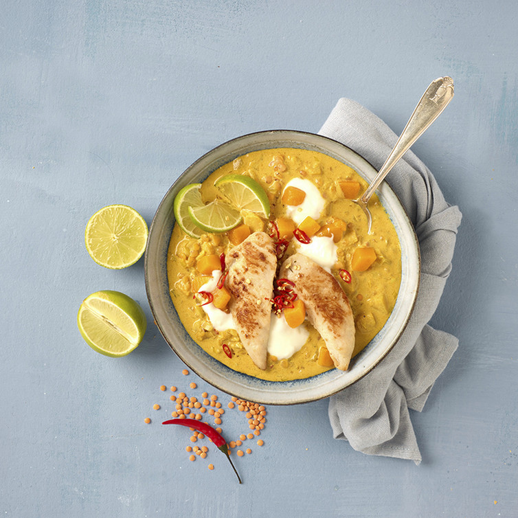 Schnelles Kürbis-Linsencurry mit Hähnchen
