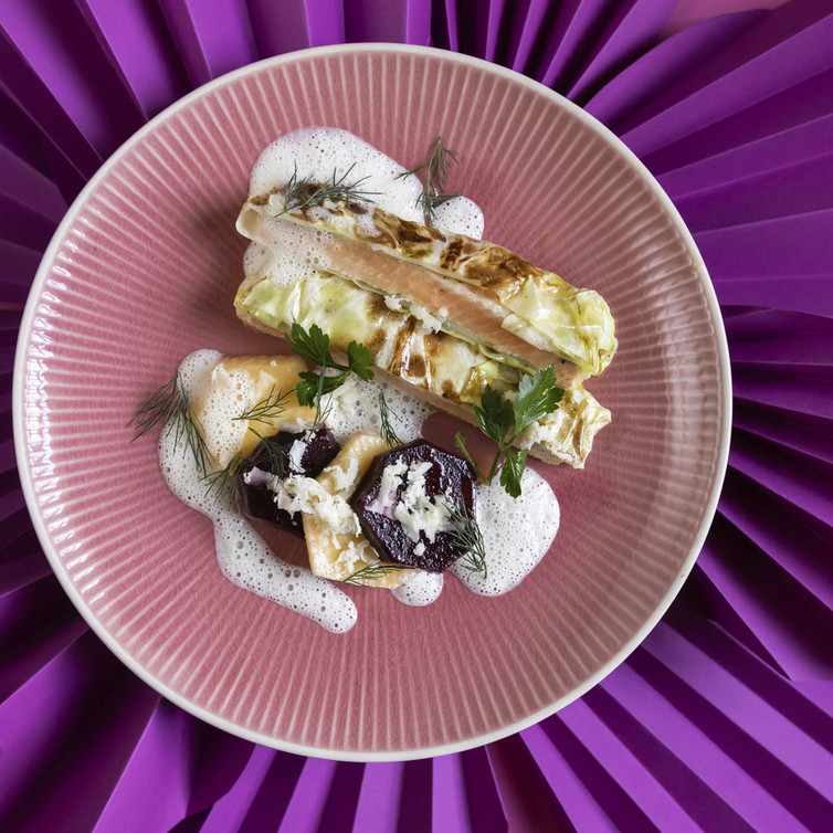 Saibling mit der Limettenbutter einstreichen und wie ein Paket im Spitzkohlblatt verpacken. Rote und gelbe Bete schälen und in 3 cm dicke Scheiben schneiden.