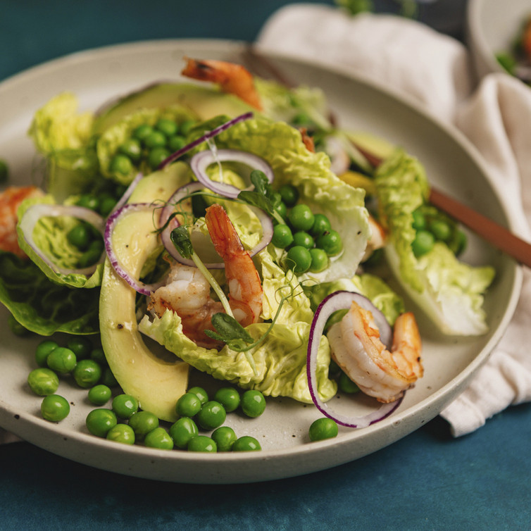 Sommerlicher Salat mit Erbsen, Avocado und Garnelen