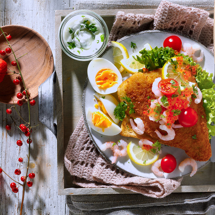 Weißbrot toasten. Jede Scheibe mit Salatblatt, Schollenfilet, Tiefseegarnelen, Kaviar, Eier- und Tomatenscheiben belegen. Mit einem Klacks Kräuterremoulade oder -Frischkäse, Zitronenscheibe und Dill dekoriert servieren. Oder nach Belieben die Remoulade in einem Schälchen dazu reichen.