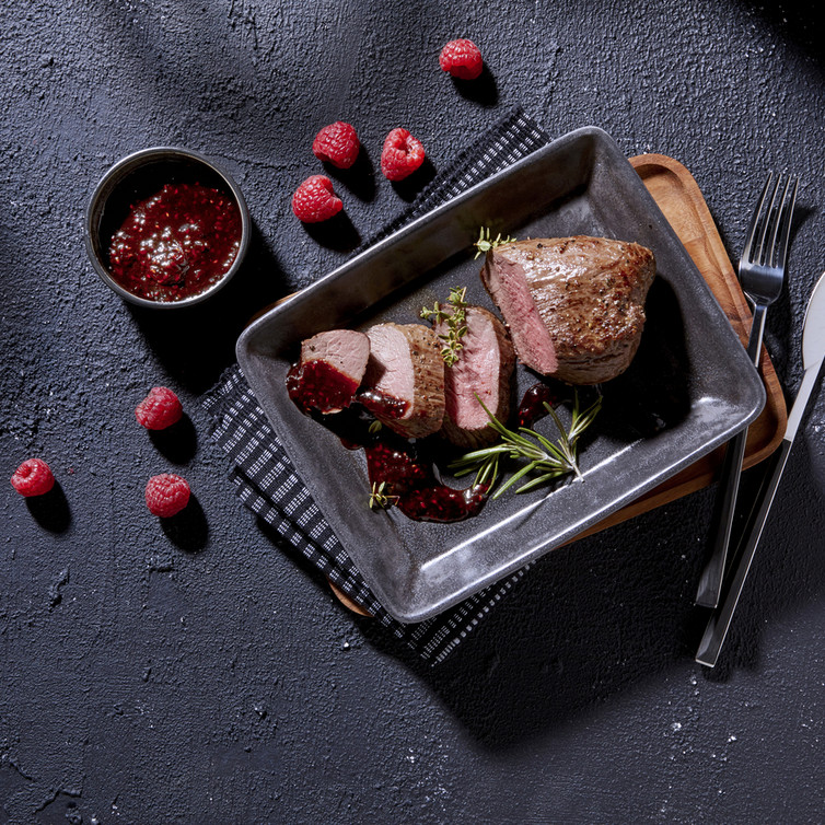Zum Anrichten die Steaks in Tranchen schneiden und mit der Himbeer Balsamico Juice beträufeln. Mit den restlichen Rosmarin und Thymian Zweigen dekoriert servieren.