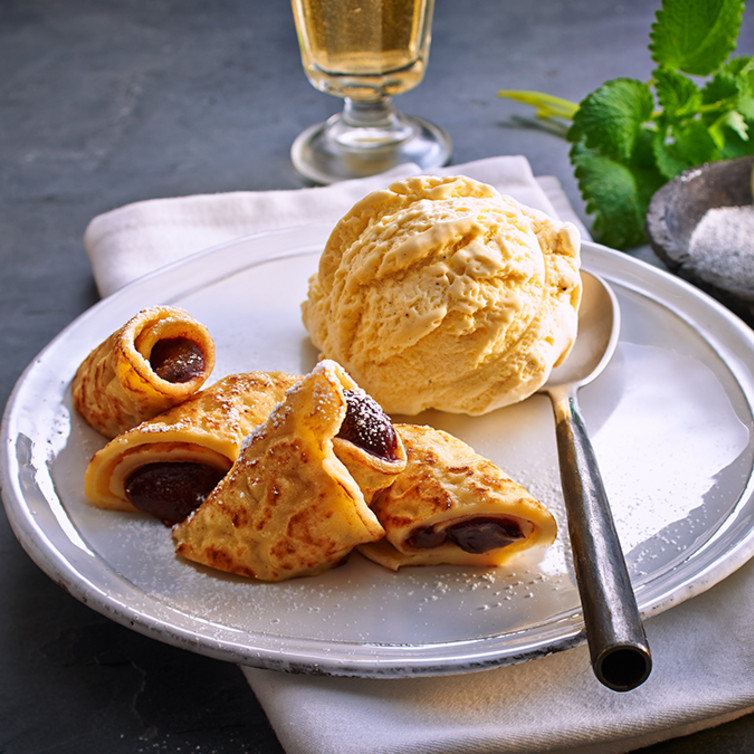 Auf einen warmen Teller setzen und mit einer Kugel Vanille Eis und Puderzucker, oder Kakaopulver bestreut servieren.