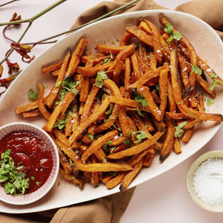 Den Backofen auf 200 °C vorheizen. Die tiefgefrorenen Süßkartoffel-Pommes aus der Verpackung nehmen und auf ein mit Backpapier ausgelegtes Backblech legen. Im Backofen auf mittlerer Schiene ca. 20 Minuten knusprig zubereiten.