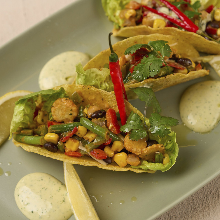 Die Tacos mit der heißen Gemüsemischung füllen. Mit der frisch zubereiteten Mayonnaise, Salatspitzen, Koriander, Chili und geriebenem Gouda garnieren. Sofort servieren und genießen!