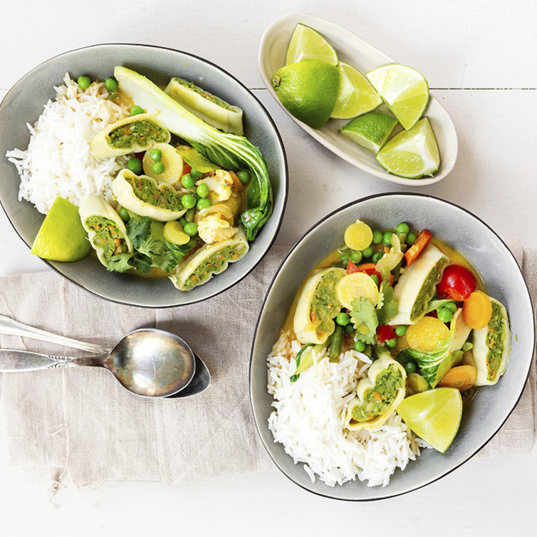 Im Wok das Öl erhitzen und den bunten Gemüseteller pfannenrührend ca. 4 Minuten garen. Nun die Paprika und den Pak Choi dazu geben, kurz mit anbraten und alles mit der Curry-Kokosmilch ablöschen.