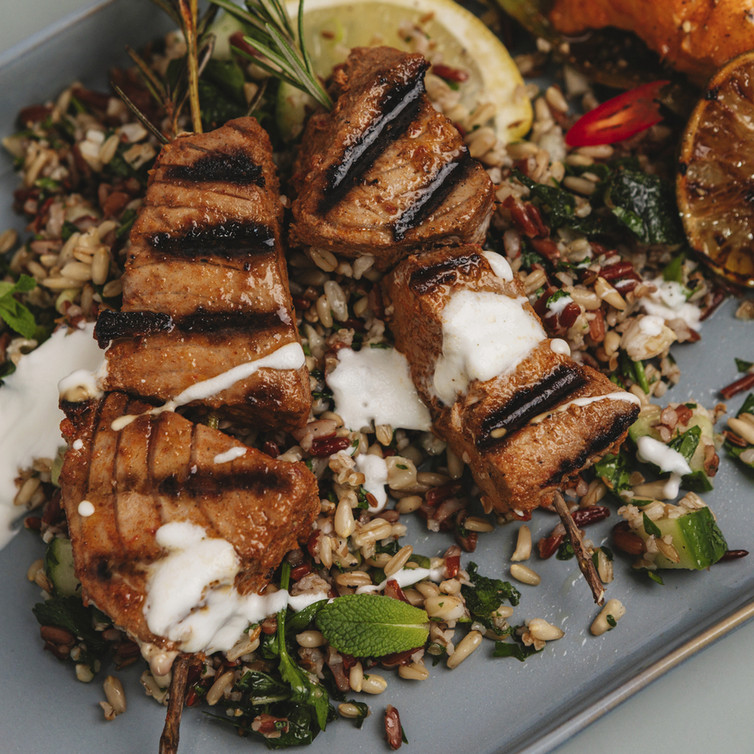 Thunfisch-Kebabs auf Rosmarinzweigen mit Kräuter-Taboulé und Joghurt