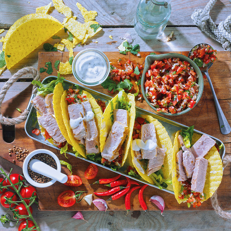 Die Taco-Shells mit den Salatstreifen, der Pico de Gallo und den Thunfischstreifen belegen. Mit der Joghurt- oder Remouladensauce dekorieren und sofort servieren.
