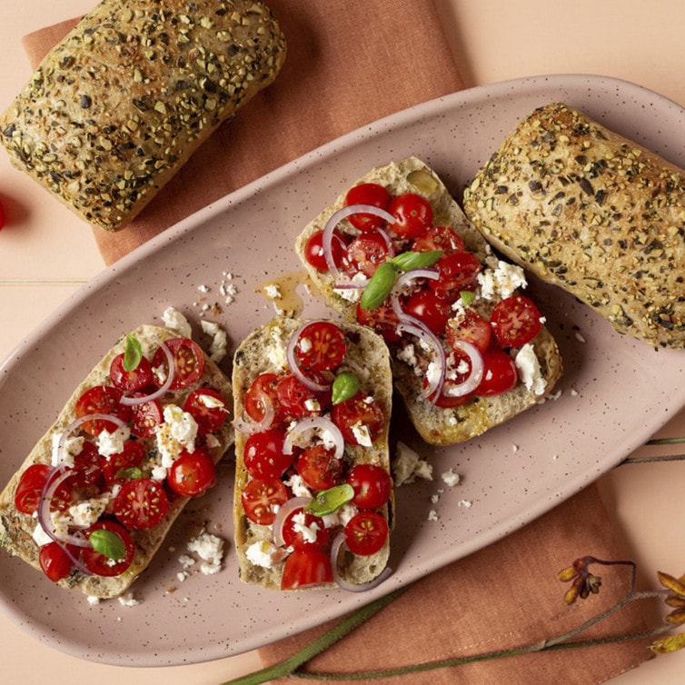 Tomaten-Feta-Salat auf Knusperbrötchen