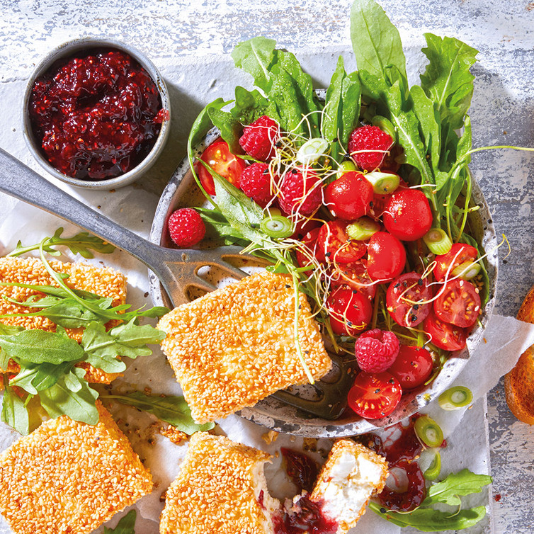 Überbackener Schafskäse mit Himbeer-Rosen-Fruchtaufstrich