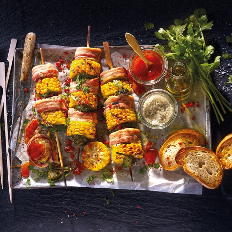 Maak de spiesen door de varkensfiletmedaillons, de stukken mais en de gehalveerde jalapeño-pepers om en om aan de spies te rijgen.