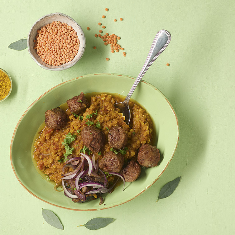 Vegane kein-Hack Bällchen mit Tomaten-Linsen-Dal und Zwiebel-Tarka