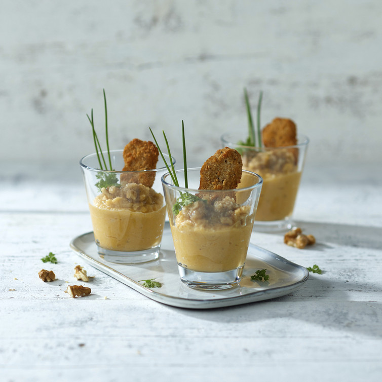 Vegane Nuggets mit Kürbis-Humus und Walnuss-Pesto