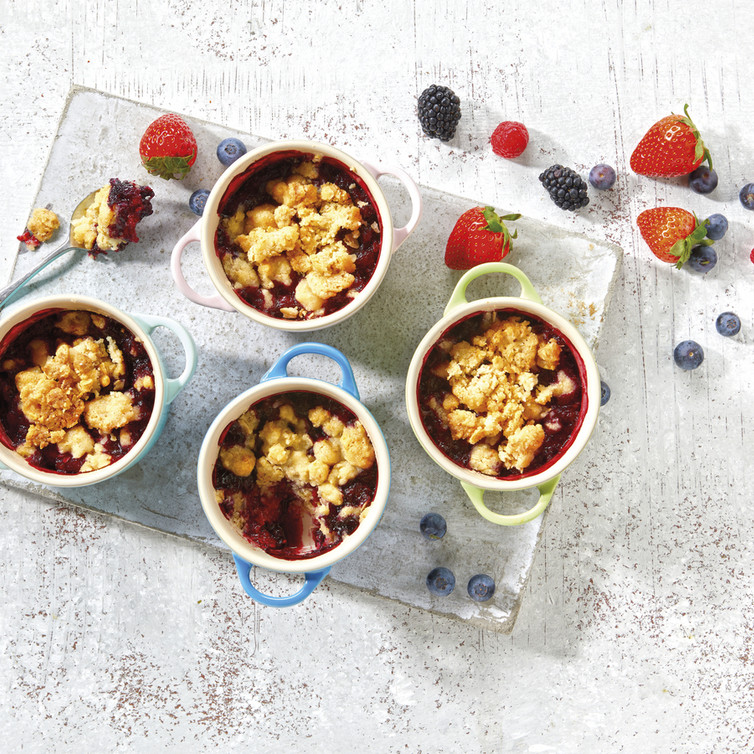 Von der Margarine mit dem Pinsel etwas abnehmen und 4 flache Portionsauflaufförmchen damit ausstreichen. Die Beeren direkt hineingeben.