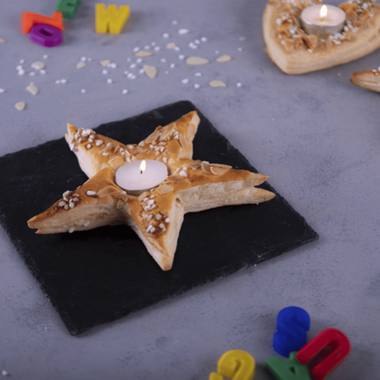 Bak het bladerdeeg ongeveer 20-25 minuten goudbruin. Maak van het resterende deeg kleine sterren of andere vormen en bestrijk ook deze met ei en bestrooi met suikerparels en amandelschaafsel. Bak deze ook goudbruin in de oven.