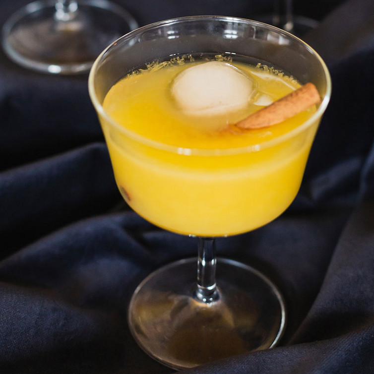 Alle Zutaten außer der Zimtstange im Shaker mixen.