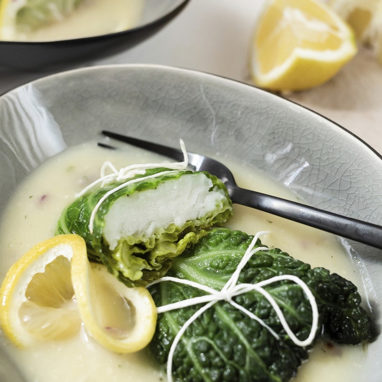 Wirsing-Heilbutt-Roulade mit Sauce Blanquette