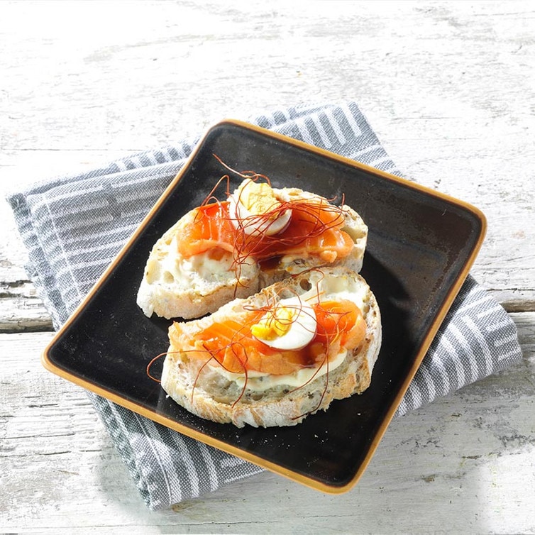 Plaats de chia-spelt ciabatta op een bakplaat met bakpapier en laat 10 minuten ontdooien. Bak ze daarna in een voorverwarmde oven op 200 °C gedurende 12 minuten totdat ze goudbruin zijn. Kook ondertussen de kwarteleieren in kokend water ca. 3-4 minuten. Laat daarna afkoelen en pel ze. Ontdooi de zalm volgens de instructies op de verpakking en halveer de plakjes wanneer nodig.