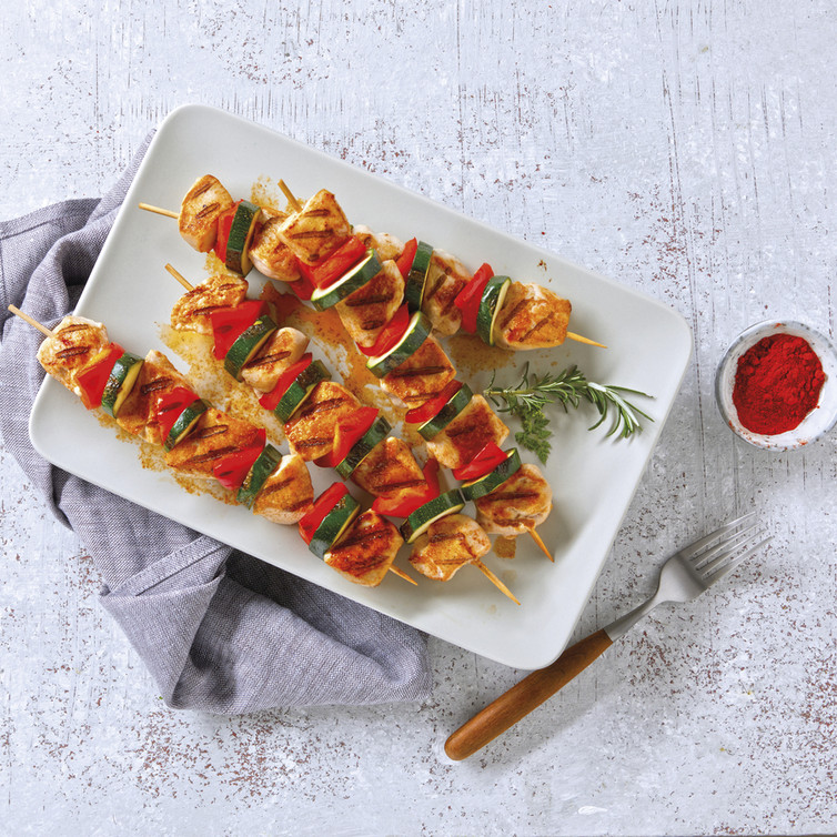 Pflanzenöl mit Paprikapulver nach Geschmack verrühren, die Spieße damit einpinseln und grillen.