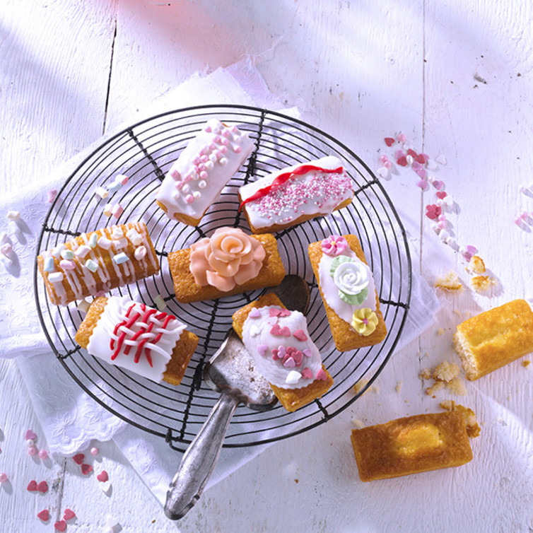Dekor-Fondant zwischen einem aufgeschnittenen Gefrierbeutel dünn ausrollen, in die gewünschte Form schneiden und auf das Küchlein legen. Etwas andrücken.