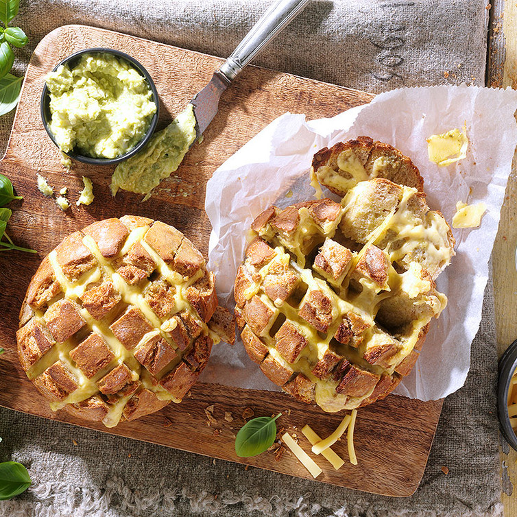 Pesto mit Butter vermengen. Käse in Streifen schneiden. Die Brot-Einschnitte mit Pesto-Butter ausstreichen und mit Käsestreifen füllen. Brote in Alufolie wickeln und am Rand des Grills ca. 25 - 30 Minuten grillen, bis der Käse geschmolzen ist.