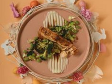 Zalm teriyaki op bloemkoolcrème en geroosterde groene groenten