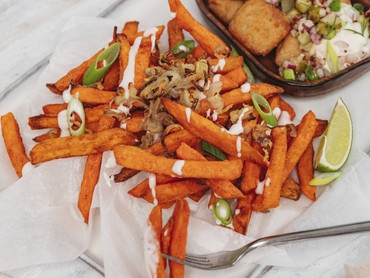 Süßkartoffelpommes mit Trüffelmayo & Knusperschalotten