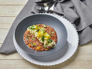 Linsen-Bolognese mit Zucchini & Basilikum-Minz-Pesto