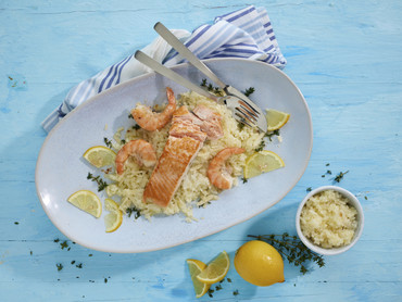 Zitronenrisotto mit pochierter Scholle und Garnelen
