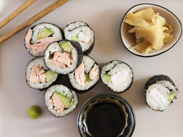 Sushi mit gebackenem Lachs und Riesengarnelen
